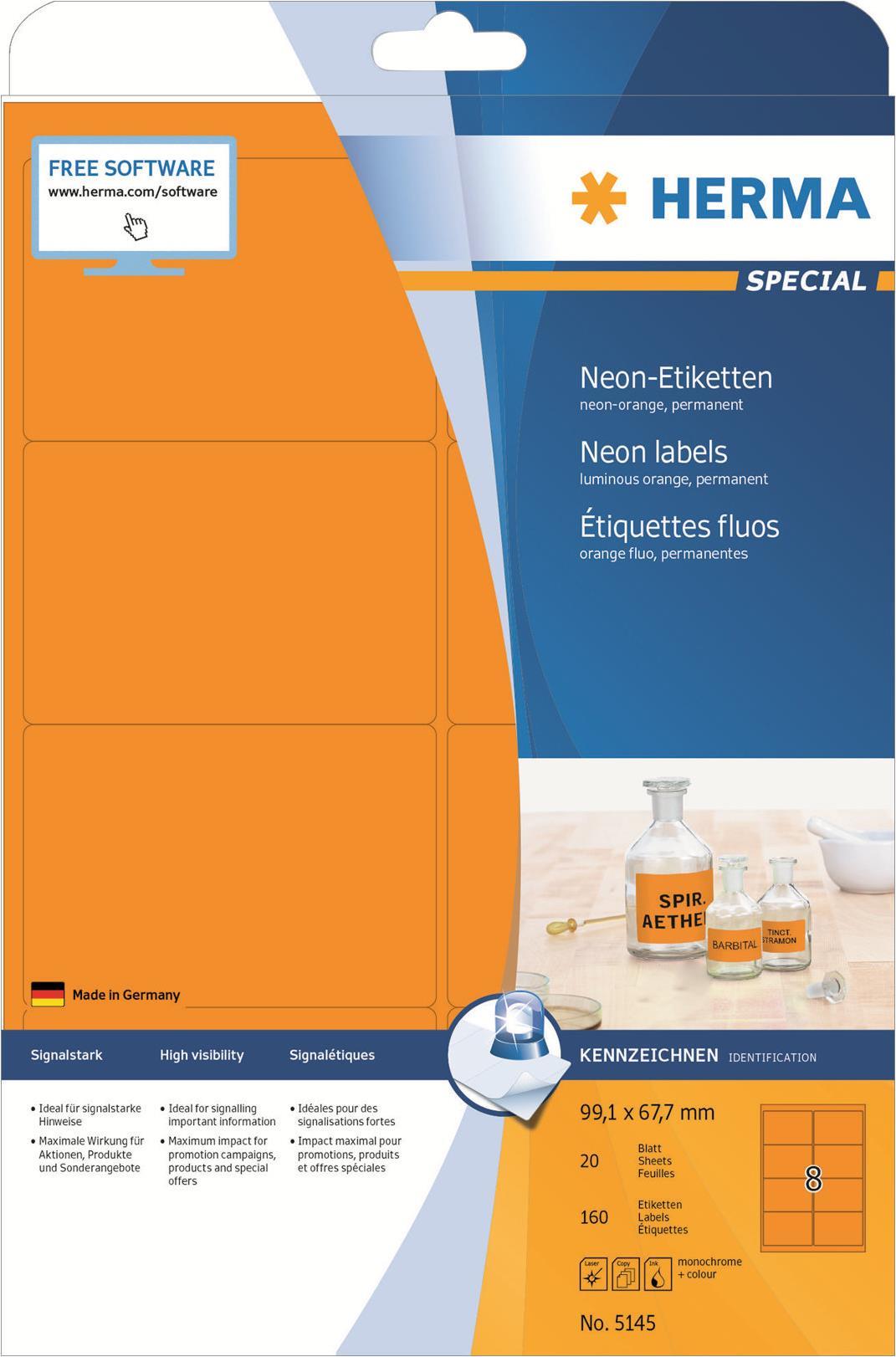 HERMA Special - Permanent selbstklebende, matte, fluoreszierende Papieretiketten - Luminous Orange - 99,1 x 67,7 mm - 160 Etikett(en) (20 Bogen x 8) (5145)