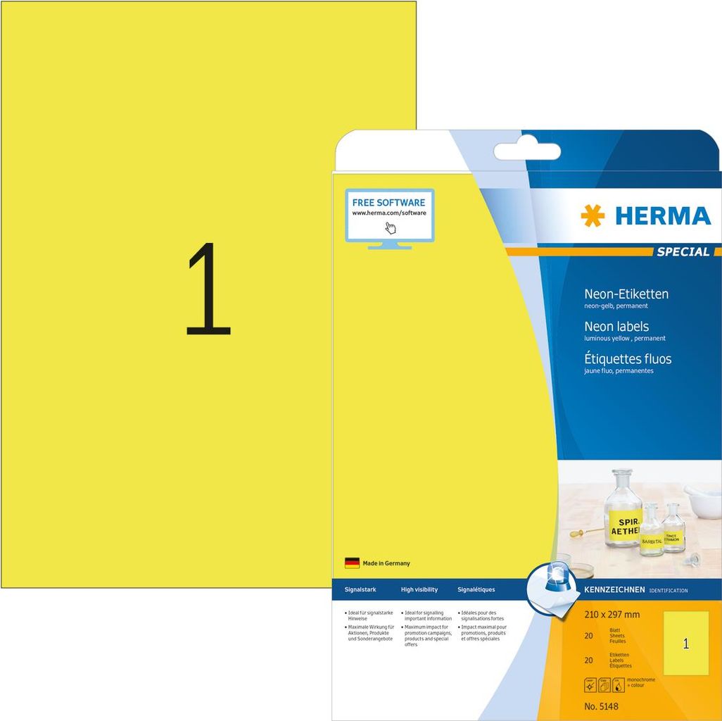 HERMA Special - Permanent self-adhesive matte fluorescent paper labels - Leuchtendes Gelb - A4 (210 x 297 mm) - 20 Etikett(en) (5148)