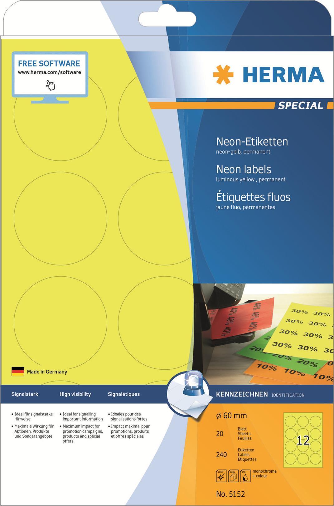 HERMA Special - Permanent selbstklebende, matte, fluoreszierende Papieretiketten - Leuchtendes Gelb - 60 mm rund - 240 Etikett(en) (20 Bogen x 12) (5152)