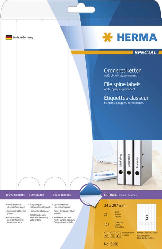 HERMA Special - Permanent selbstklebende, matte, lichtundurchlässige Aktenetiketten aus Papier - weiß - 34 x 297 mm - 125 Etikett(en) (25 Bogen x 5) - (5158)