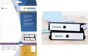 Ordneretiketten auf A4-Blättern, selbstklebend. Für ein einheitliches Erscheinungsbild im Büro und Zuhause. Für alle gängigen Ordner geeignet. Absolut blickdichtes Material mit hohem Weißgrad, alte Ordnerbeschriftungen scheinen nicht durch. Blanko: Ideal für Firmenlogo, Beschriftungen und Ordnungsvermerke. Sicher haftend, auch bei häufigem Ordnergebrauch. Umweltfreundlich: hochwertiges, chlorfrei gebleichtes Spezialpapier, PEFC-zertifiziert, lösemittelfreier Haftkleber. Etiketten sind 100 % recyclingfähig mit dem Altpapier, Verpackung aus Recyclingkarton. Sehr gute Druckergebnisse auf allen Laser- und Inkjetdruckern, Kopierern, Farblaserdruckern und Farbkopierern. Störungsfreie Verarbeitung durch Rundum-Sicherheitskante und optimale Planlage. Kostenlose Softwarelösungen: www.herma.de/software.