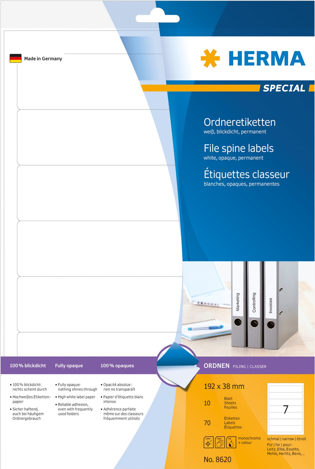 Ordneretiketten auf A4-Blättern, selbstklebend. Für ein einheitliches Erscheinungsbild im Büro und Zuhause. Für alle gängigen Ordner geeignet. Absolut blickdichtes Material mit hohem Weißgrad, alte Ordnerbeschriftungen scheinen nicht durch. Blanko: Ideal für Firmenlogo, Beschriftungen und Ordnungsvermerke. Sicher haftend, auch bei häufigem Ordnergebrauch. Umweltfreundlich: hochwertiges, chlorfrei gebleichtes Spezialpapier, PEFC-zertifiziert, lösemittelfreier Haftkleber. Etiketten sind 100 % recyclingfähig mit dem Altpapier, Verpackung aus Recyclingkarton. Sehr gute Druckergebnisse auf allen Laser- und Inkjetdruckern, Kopierern, Farblaserdruckern und Farbkopierern. Störungsfreie Verarbeitung durch Rundum-Sicherheitskante und optimale Planlage. Kostenlose Softwarelösungen: www.herma.de/software.