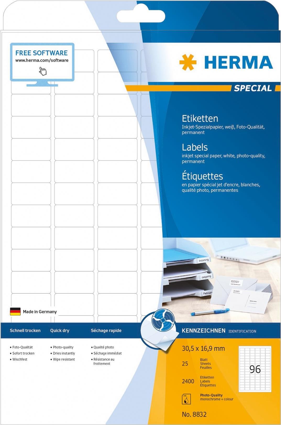 HERMA Special - Permanent self-adhesive matte coated paper labels - weiß - 30,5 x 16,9 mm - 90 g/m2 - 2400 Etikett(en) (25 Bogen x 96) (8832)