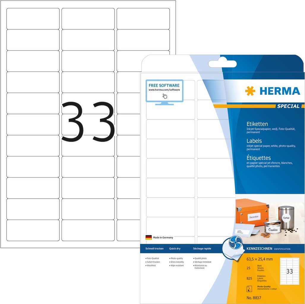 HERMA Special - Permanent selbstklebende, matte, beschichtete Papieretiketten - weiß - 63,5 x 25,4 mm - 90 g/m2 - 825 Etikett(en) (25 Bogen x 33) (8837)
