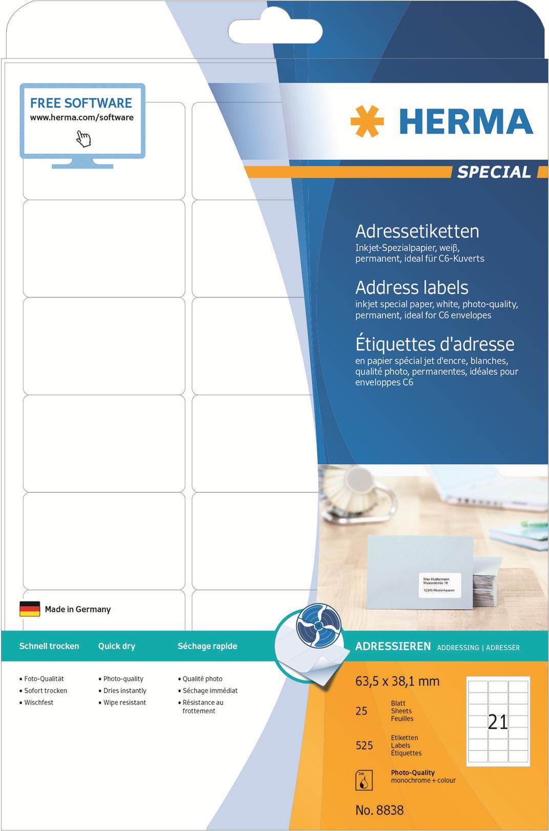 HERMA Special - Permanent selbstklebende, matte, beschichtete Adressetiketten aus Papier - weiß - 63,5 x 38,1 mm - 90 g/m2 - 525 Etikett(en) (25 Bogen x 21) (8838)