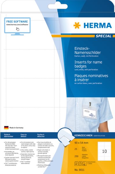 HERMA Special - Nichtklebende Namens-Badge-Karten - weiß - 90 x 54 mm 250 Karte(n) (25 Bogen x 10) (9011)