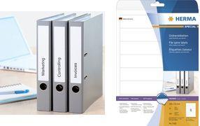 Ordneretiketten auf A4-Blättern, selbstklebend. Für ein einheitliches Erscheinungsbild im Büro und Zuhause. Für alle gängigen Ordner geeignet. Absolut blickdichtes Material mit hohem Weißgrad, alte Ordnerbeschriftungen scheinen nicht durch. Blanko: Ideal für Firmenlogo, Beschriftungen und Ordnungsvermerke. Sicher haftend, auch bei häufigem Ordnergebrauch. Umweltfreundlich: hochwertiges, chlorfrei gebleichtes Spezialpapier, PEFC-zertifiziert, lösemittelfreier Haftkleber. Etiketten sind 100 % recyclingfähig mit dem Altpapier, Verpackung aus Recyclingkarton. Sehr gute Druckergebnisse auf allen Laser- und Inkjetdruckern, Kopierern, Farblaserdruckern und Farbkopierern. Störungsfreie Verarbeitung durch Rundum-Sicherheitskante und optimale Planlage. Kostenlose Softwarelösungen: www.herma.de/software.