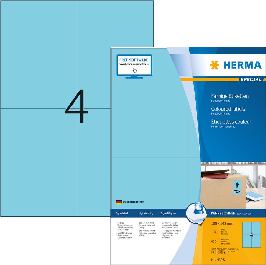 Farbige Etiketten auf A4-Blättern, selbstklebend. Ideal für Kennzeichnungen mit Signalcharakter, z. B. Warnhinweise, Eilvermerke, Adressänderungen, Farbcodierung, Aktionen,... Umweltfreundlich: FSC Mix Credit-zertifiziertes Etikettenpapier, chlorfrei gebleicht, lösemittelfreier Haftkleber. Etiketten sind 100 % recyclingfähig mit dem Altpapier, Verpackung aus Recyclingkarton. Sehr gute Druckergebnisse auf allen Laser- und Inkjetdruckern, Kopierern, Farblaserdruckern und Farbkopierern. Störungsfreie Verarbeitung durch Rundum-Sicherheitskante und optimale Planlage. Kostenlose Softwarelösungen: www.herma.de/software.