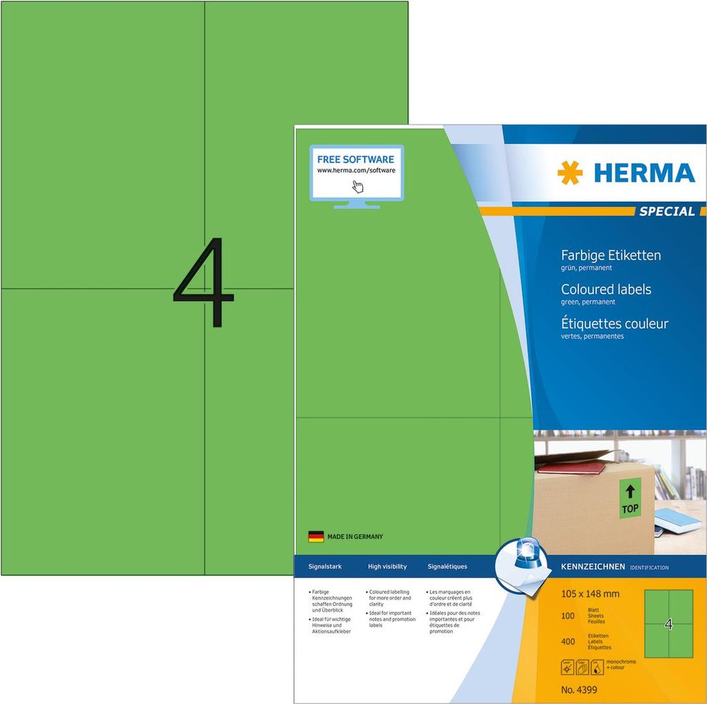 Farbige Etiketten auf A4-Blättern, selbstklebend. Ideal für Kennzeichnungen mit Signalcharakter, z. B. Warnhinweise, Eilvermerke, Adressänderungen, Farbcodierung, Aktionen,... Umweltfreundlich: FSC Mix Credit-zertifiziertes Etikettenpapier, chlorfrei gebleicht, lösemittelfreier Haftkleber. Etiketten sind 100 % recyclingfähig mit dem Altpapier, Verpackung aus Recyclingkarton. Sehr gute Druckergebnisse auf allen Laser- und Inkjetdruckern, Kopierern, Farblaserdruckern und Farbkopierern. Störungsfreie Verarbeitung durch Rundum-Sicherheitskante und optimale Planlage. Kostenlose Softwarelösungen: www.herma.de/software.