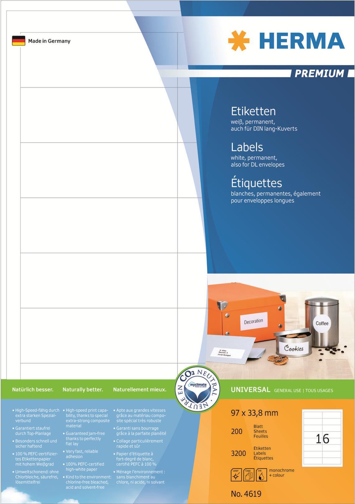Selbstklebende Etiketten auf A4-Blättern, permanent haftend. Perfekt für alle Laser- und Inkjetdrucker, Kopierer, Farblaserdrucker und Farbkopierer. Garantiert staufrei und high-speed-fähig durch extra starken Spezialverbund, Top-Planlage und Rundum-Sicherheitskante. Problemloser Druckerdurchlauf für Laserdrucker und Inkjetdrucker getestet und bestätigt durch den TÜV SÜD. Hoher Weißgrad und gleichmäßige Oberfläche für beste Druckergebnisse in Schwarz und Farbe. Spürbar dicker: extra starke Etiketten - einfaches Aufkleben. Besonders schnell und sicher haftend, auch auf kühlen und feuchten Oberflächen. Umweltschonend und nachhaltig: chlorfrei gebleicht, PEFC-zertifiziert, lösemittelfreier Haftkleber. Etiketten sind 100 % recyclingfähig mit dem Altpapier, Verpackung aus Recyclingkarton. Kostenlose Softwarelösungen: www.herma.de/software.