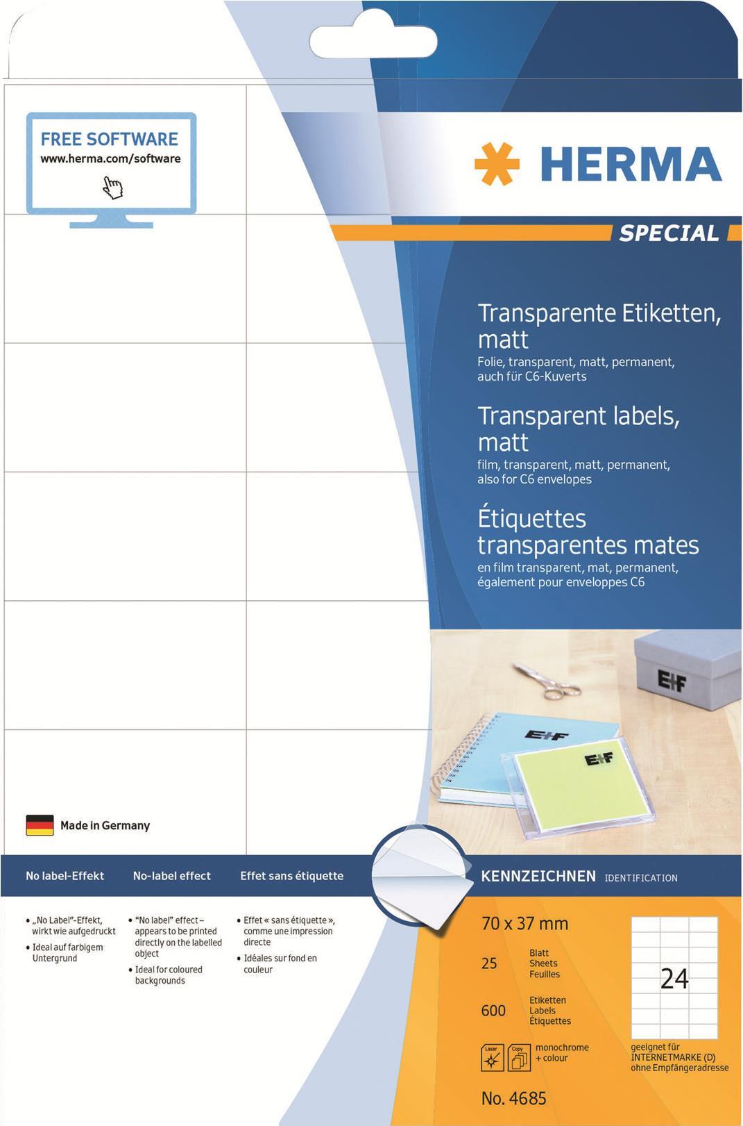 Transparente matte Folien-Etiketten auf A4-Blättern, selbstklebend. Perfekt für optisch anspruchsvolle Anwendungen, ideal auf farbigem Untergrund, Glas, Porzellan, für repräsentative Unterlagen, Aktualisierungen oder zum Adressieren. No Label-Effekt: Beschriftung wirkt wie direkt aufgedruckt. Wetterfest, alterungsbeständig, Öl und Schmutz abweisend, abwaschbar. Störungsfreie Verarbeitung durch Rundum-Sicherheitskante und optimale Planlage. Für Laserdrucker und Kopierer, Farblaserdrucker und Farbkopierer. Nicht für Inkjetdrucker geeignet. Kostenlose Softwarelösungen: www.herma.de/software.