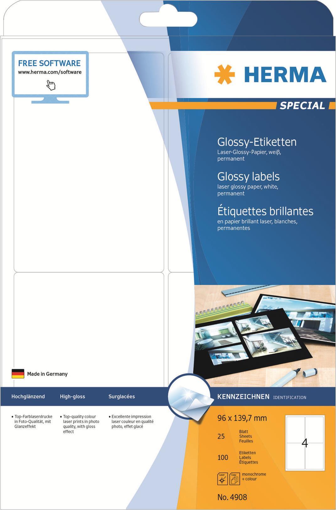 HERMA SuperPrint - Hochglanzetiketten - weiß - 96 x 139,7 mm - 100 Stck. (25 Bogen x 4) (4908)