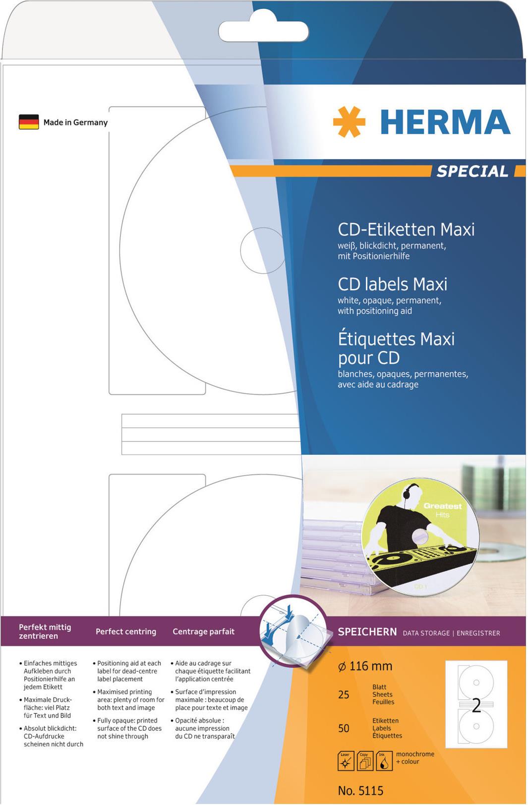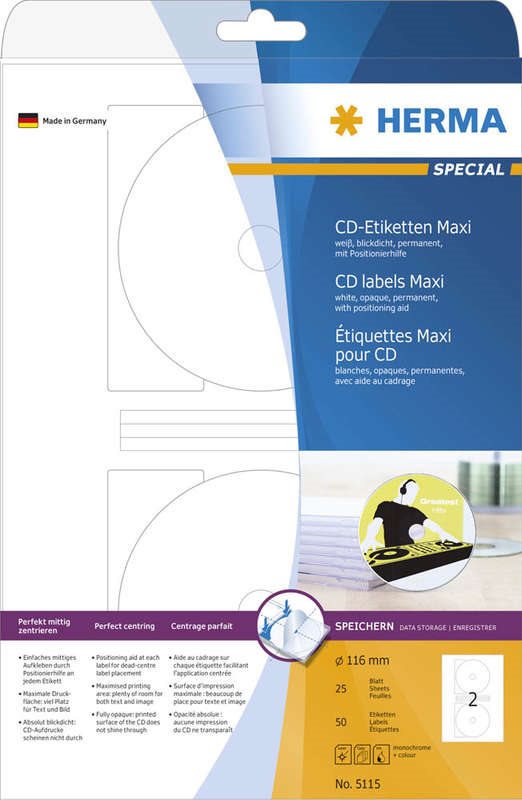 CD-Etiketten aus Papier, auf A4-Blättern, selbstklebend. Absolut blickdichtes Material mit hohem Weißgrad, CD-Aufdrucke scheinen nicht durch. Einfaches mittiges Aufkleben durch Positionierhilfe an jedem Etikett. Sichere Haftung, auch in High-Speed-Laufwerken. Umweltfreundlich: hochwertiges, chlorfrei gebleichtes Spezialpapier, PEFC-zertifiziert, lösemittelfreier Haftkleber, Verpackung aus Recyclingkarton. Sehr gute Druckergebnisse auf allen Laser- und Inkjetdruckern, Kopierern, Farblaserdruckern und Farbkopierern. Störungsfreie Verarbeitung durch Rundum-Sicherheitskante und optimale Planlage. Maxi-Format: viel Platz für Text und Bild. Kostenlose Softwarelösungen: www.herma.de/software.