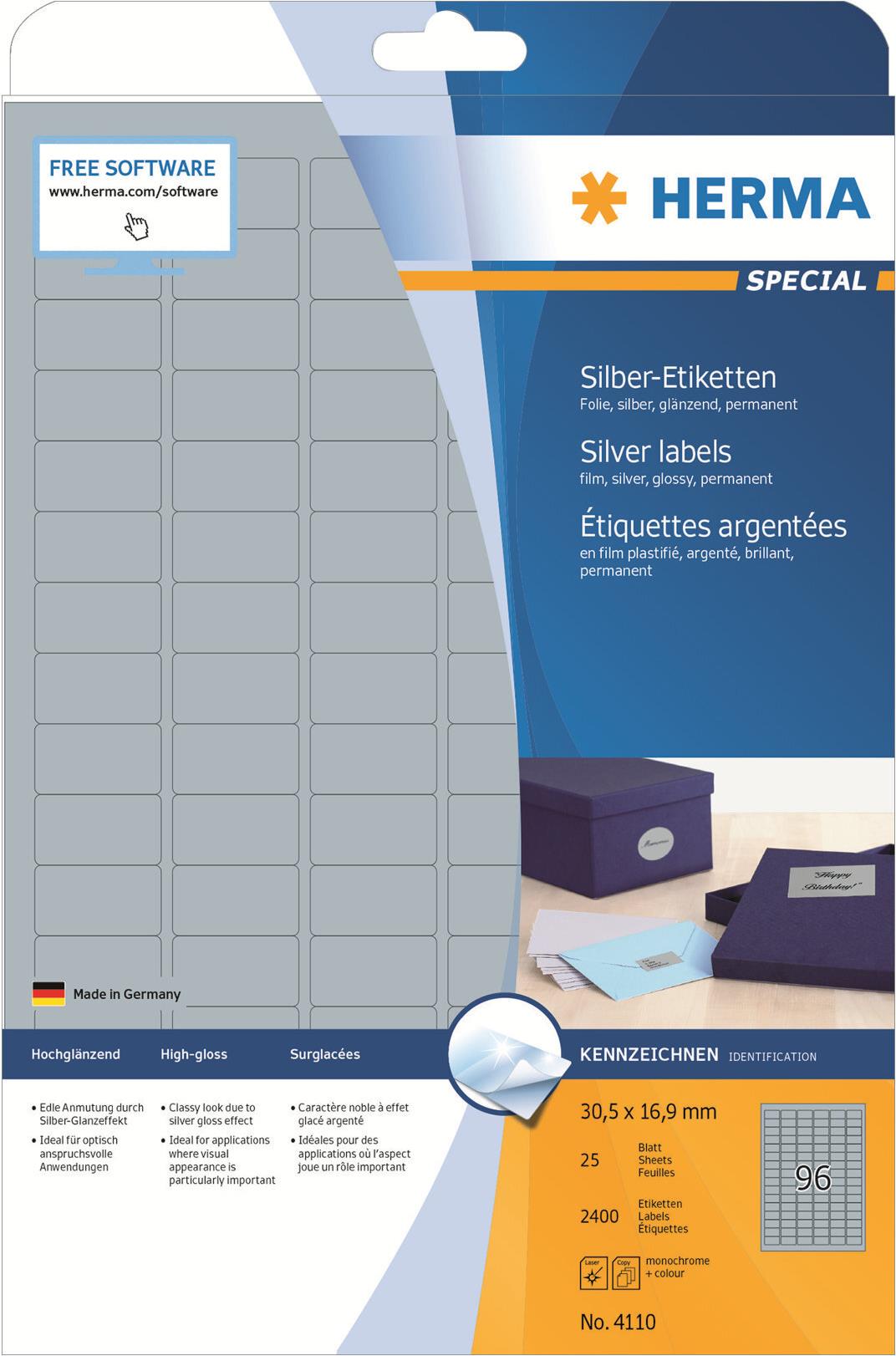 Silberfarbene Etiketten aus glänzender Polyesterfolie, auf A4-Blättern, selbstklebend. Exklusiv und glänzend, für Jubiläums- und Festetiketten, individuelle Geschenke, ausdruckstarke Präsentationen, repräsentative Produktaufkleber. Wasserfest und Schmutz abweisend, sicher haftend auf allen Oberflächen. Störungsfreie Verarbeitung durch Rundum-Sicherheitskante und optimale Planlage. Für Laserdrucker und Kopierer, Farblaserdrucker und Farbkopierer. Nicht für Inkjetdrucker geeignet. Kostenlose Softwarelösungen: www.herma.de/software.