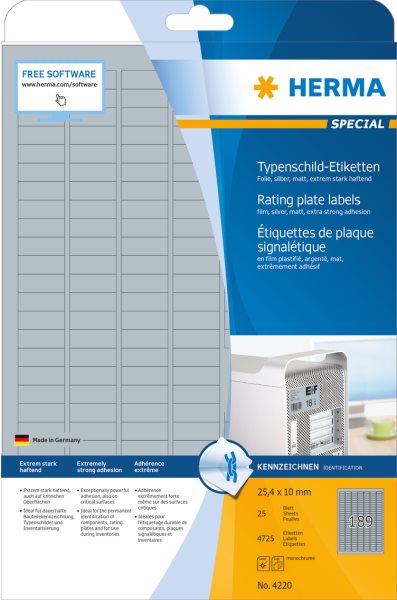 Silberfarbene Etiketten aus matter Polyesterfolie, auf A4-Blättern, selbstklebend. Ideal zur dauerhaften Bauteilekennzeichnung, als Typenschilder und zur Inventarisierung. Hochwertige Edelstahloptik. Wetterfest, alterungsbeständig, Öl und Schmutz abweisend, reißfest, abwaschbar, temperaturbeständig von -40 bis +150 °C. Extrem stark haftend, auch auf rauen oder kritischen Oberflächen. Störungsfreie Verarbeitung durch Rundum-Sicherheitskante und optimale Planlage. Für Laserdrucker und Kopierer. Nicht für Inkjetdrucker, Farblaserdrucker und Farbkopierer geeignet. Kostenlose Softwarelösungen: www.herma.de/software.