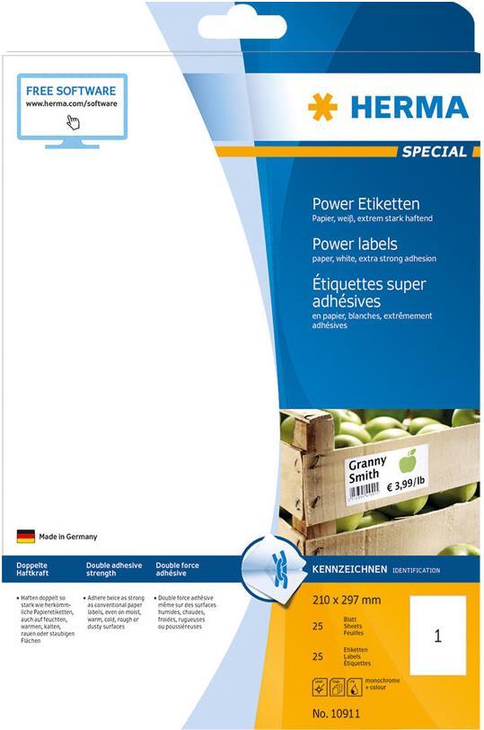 HERMA Special Power Labels - Papier - matt - extra strong adhesive - weiß - A4 (210 x 297 mm) 25 Blatt Etiketten (10911)