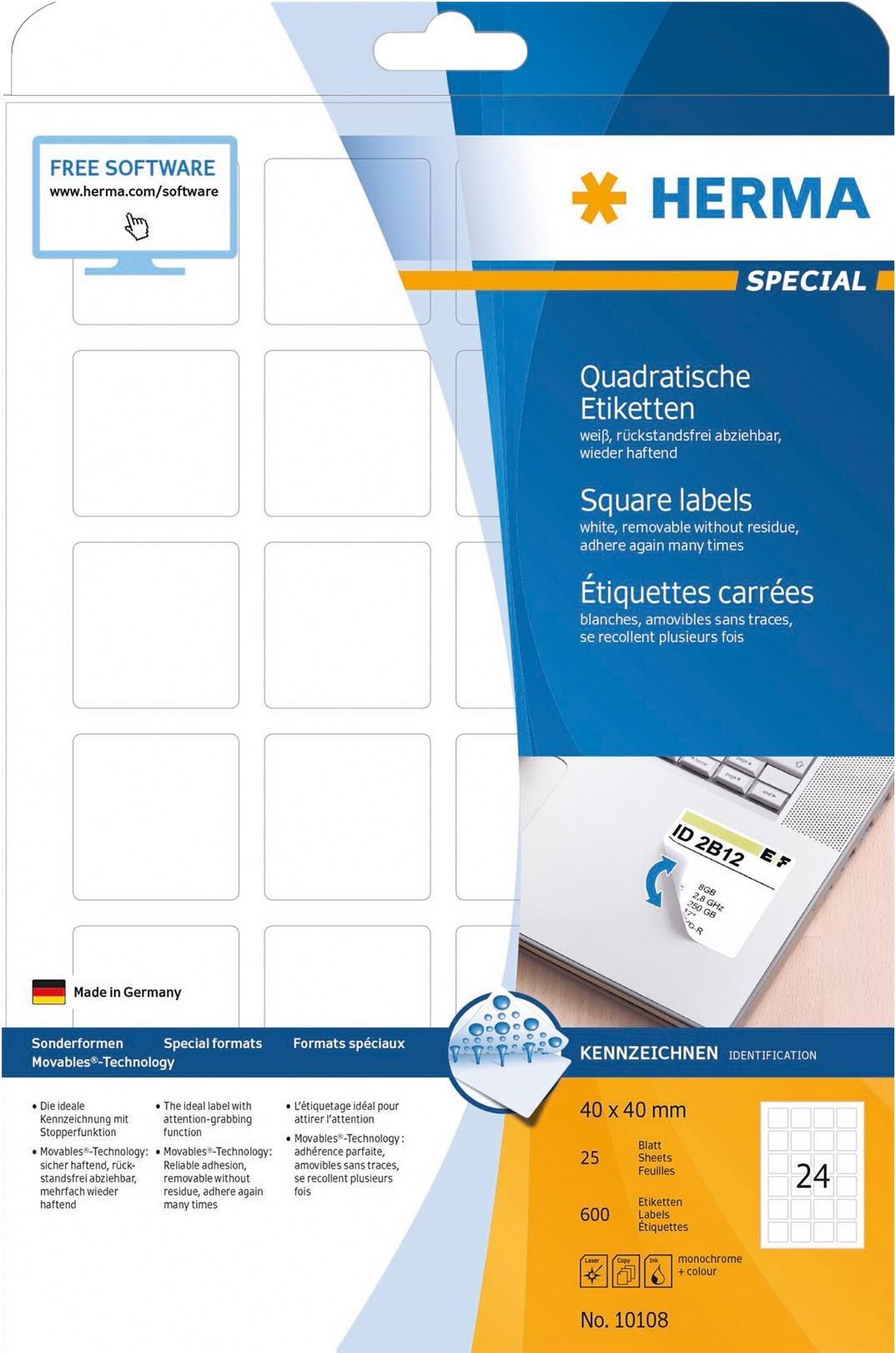 HERMA Special - Selbstklebende, abziehbare, matte Papieretiketten - weiß - 40 x 40 mm 600 Etikett(en) (25 Bogen x 24) (10108)