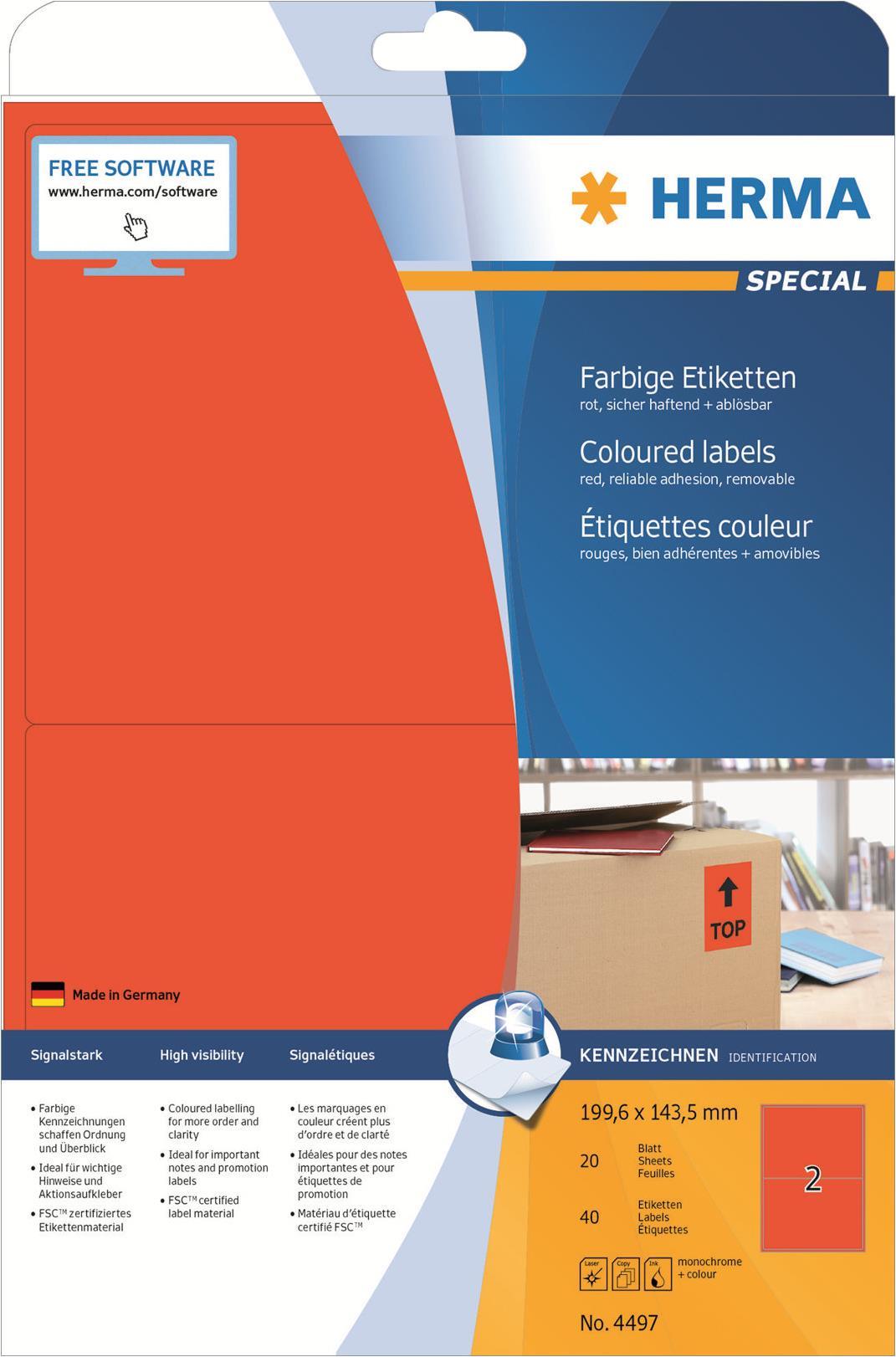 Farbige Etiketten auf A4-Blättern, selbstklebend. Ideal für Kennzeichnungen mit Signalcharakter, z. B. Warnhinweise, Eilvermerke, Adressänderungen, Farbcodierung, Aktionen,... Umweltfreundlich: FSC Mix Credit-zertifiziertes Etikettenpapier, chlorfrei gebleicht, lösemittelfreier Haftkleber. Etiketten sind 100 % recyclingfähig mit dem Altpapier, Verpackung aus Recyclingkarton. Sehr gute Druckergebnisse auf allen Laser- und Inkjetdruckern, Kopierern, Farblaserdruckern und Farbkopierern. Störungsfreie Verarbeitung durch Rundum-Sicherheitskante und optimale Planlage. Kostenlose Softwarelösungen: www.herma.de/software.