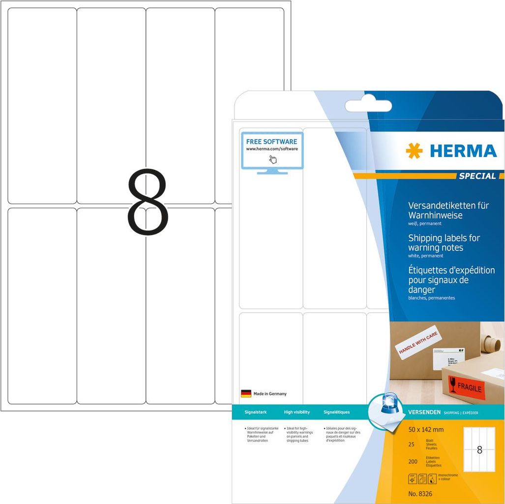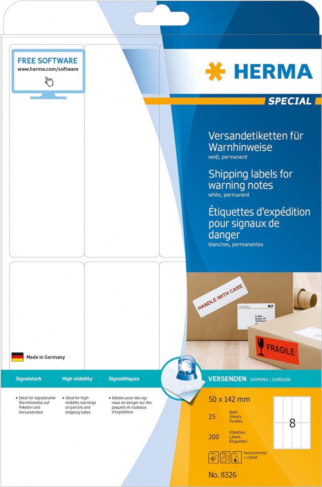 HERMA Special - Permanent selbstklebende, matte Versand-/Warnhinweisetiketten aus Papier - weiß - 50 x 142 mm 200 Etikett(en) (25 Bogen x 8) (8326)