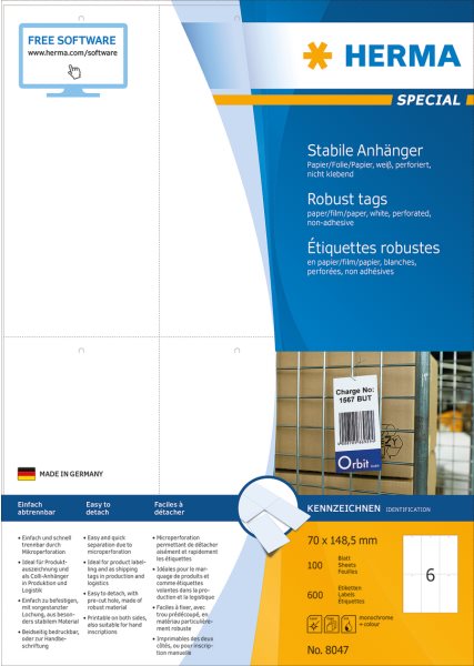 Etiketten aus stabilem Papier/Folie/Papier-Verbund, auf A4-Blättern, nicht klebend. Ideal für Produkt- und Preisauszeichnung, z.B. an Textilien oder Stoffballen oder als Colli-Anhänger. Mit vorgestanzter Lochung für die Befestigung mit Etikettierpistolen, Nylon/Faden, Draht, Schnur oder Fäden/Splinte. Einfach und schnell trennbar durch Mikroperforation. Für Laser- und Inkjetdrucker, Kopierer, Farblaserdrucker und Farbkopierer, beidseitig bedruckbar, oder zur Handbeschriftung. Kostenlose Softwarelösungen: www.herma.de/software.