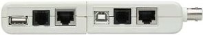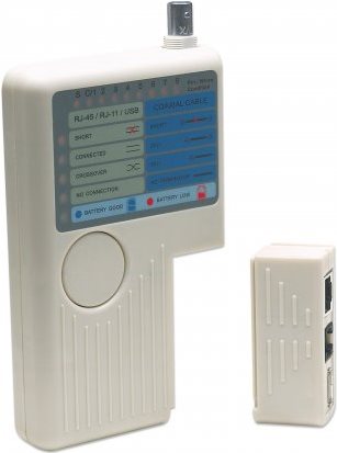 Der 4-in-1 Kabeltester von Intellinet Network Solutions ist ein günstiges und vielseitiges Werkzeug zum Testen von vier gängigen Netzwerk- und Computerkabeln: Ethernet (RJ45), RJ11, BNC und USB. Bei einer Reichweite bis zu 180 m prüft er auf durchgängige Verbindungen sowie auf offene Drähte und Kurzschlüsse. Die jeweiligen Fehler und betroffenen Pins können auf den Geräte-LEDs abgelesen werden.