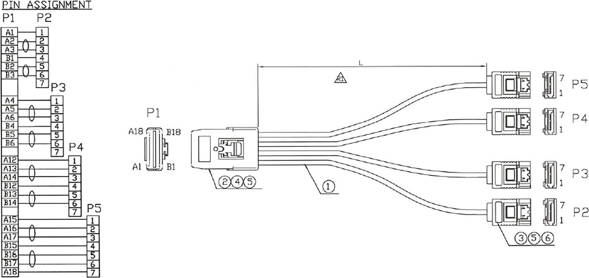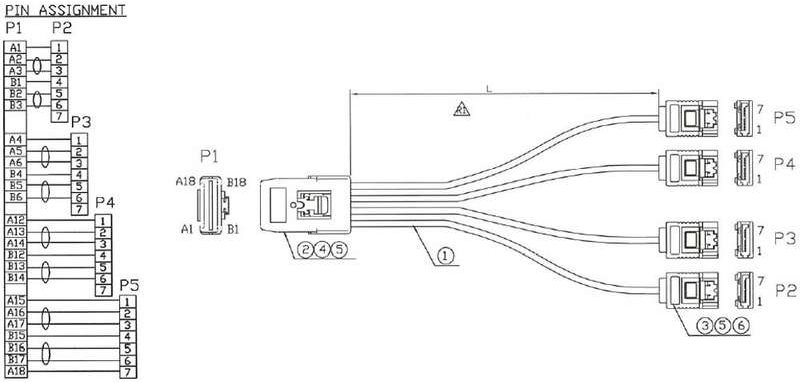 SAS Anschlusskabel, Mini-SAS SFF-8087 (36pin) an 4x SATA, 1:1 Belegung (= straight through = reverse breakout, OCR), zum Anschließen von Laufwerken oder Backplanes an einen Host-Controller mit 4 SATA Anschlüssen. Kompatibel mit SATA bis 6Gb/s.Wichtiger Hinweis:Bitte beachten Sie die Belegung dieses Kabels! Je nach Gegebenheit bei den vorhandenen Geräten benötigen Sie stattdessen das Kabel 27610 mit gedrehter Belegung (forward, OCF). Bitte informieren Sie sich dementsprechend im Vorfeld bei den jeweiligen Geräteherstellern. Nur bei Verwendung der richtigen Belegung wird eine funktionierende Verbindung hergestellt. (Normale Verwendung: SAS Controller --> SATA Laufwerke == forward breakout // SATA Controller --> SAS Backplane == reverse breakout)
