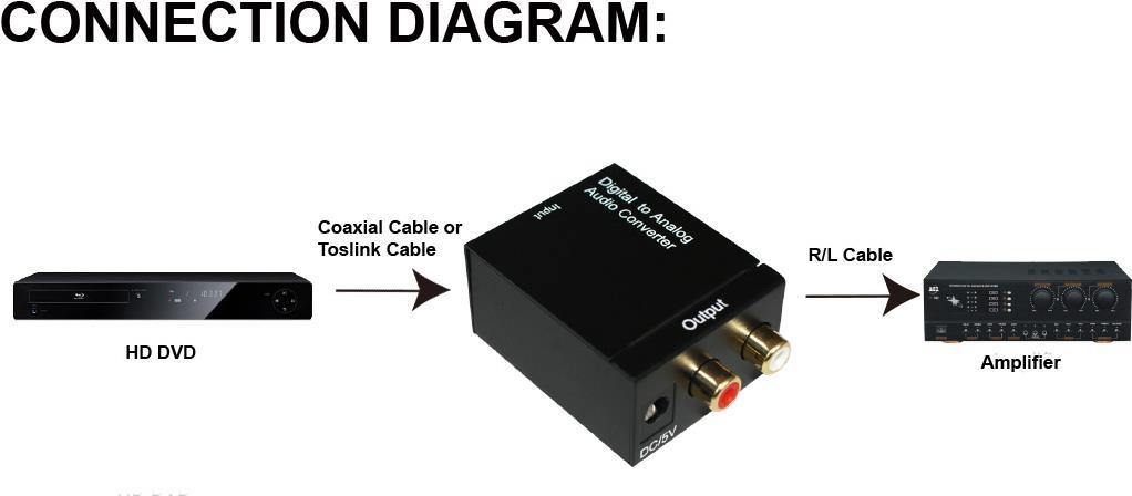 Dieser Konverter wandelt Ihre digitalen Audiosignale in analoge Audiosignale um.• Eingang: S/PDIF über Cinch Buchse oder Toslink Buchse
