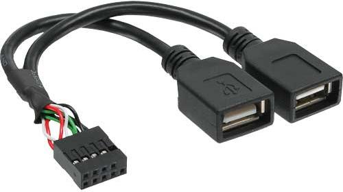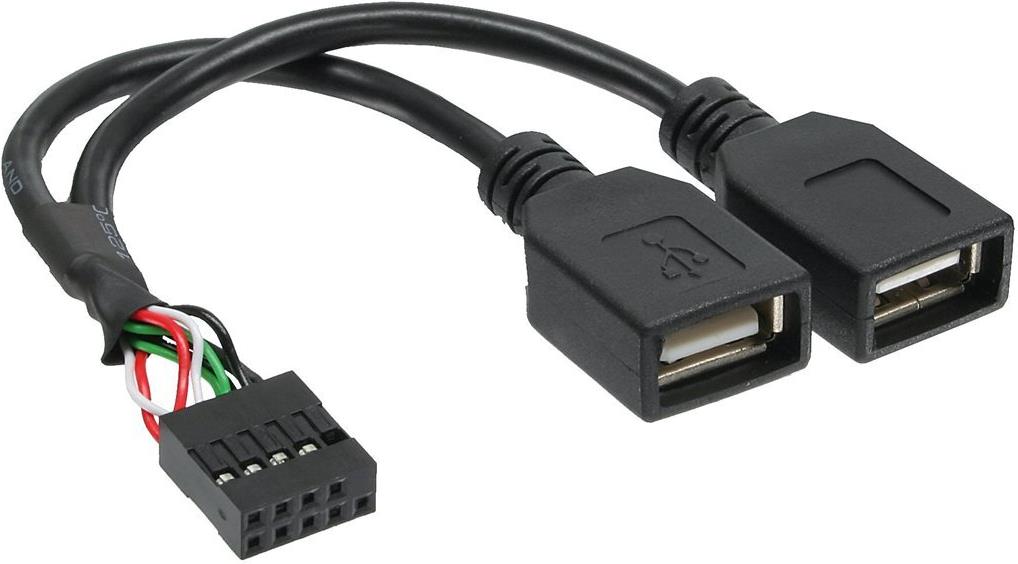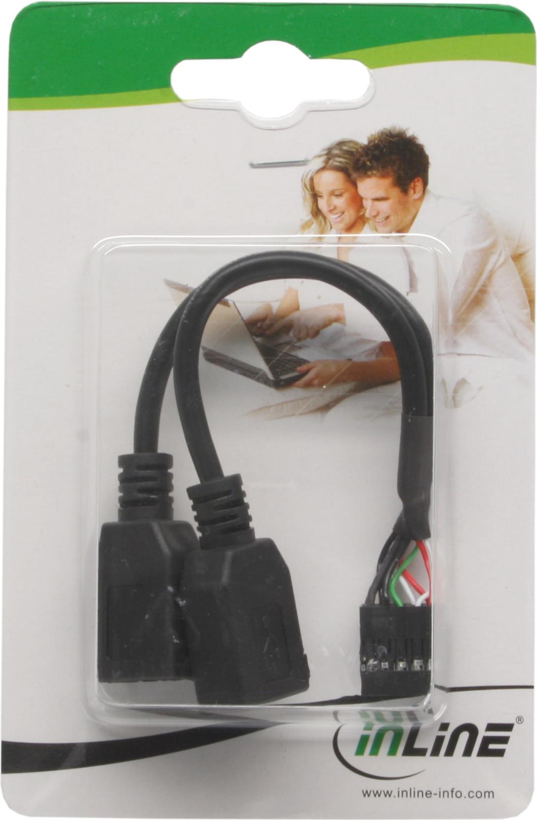 InLine® internes Splitterkabel zum Anschluss von zwei USB 2.0-Geräten an den einzigen Anschluss auf dem Motherboard.• Terminal 4+5pin Buchse auf 2x USB 2.0 Typ A Buchse.• Belegung: Rot = VCC (+5 V), Grün = Daten + (D +), Weiß = Daten (D), Schwarz = GND (Masse)• Verbindungskabel 0,2m
