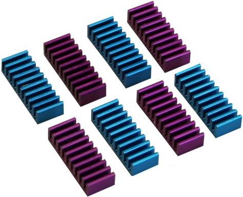 Passivkühlkörper für Speicherbausteine. Schützen Sie Ihren RAM-Speicher vor Überhitzung! Die einzelnen Kühlkörper sind schon mit Wärmeleitpads ausgestattet. • Farbe: blau, purple• Abmessungen (LxBxH): 22 x 8 x 5 mm• Menge: 8 Stück