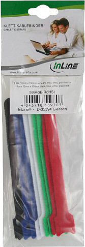 InLine® Kabelbinder 12x240mm, Klett-Verschluss, 10er, 5 versch. Farben. Die Inline® Klettkabelbinder finden in vielen Bereichen Anwendung. Sie sind schnell und einfach per Hand anzubringen und auch sehr leicht wieder zu lösen. Besonders empfehlenswert, da sie wiederverwendbar sind und zudem einen enormen Halt bieten. Widerstandsfähig gegen Seewasser, Öle und Fette.