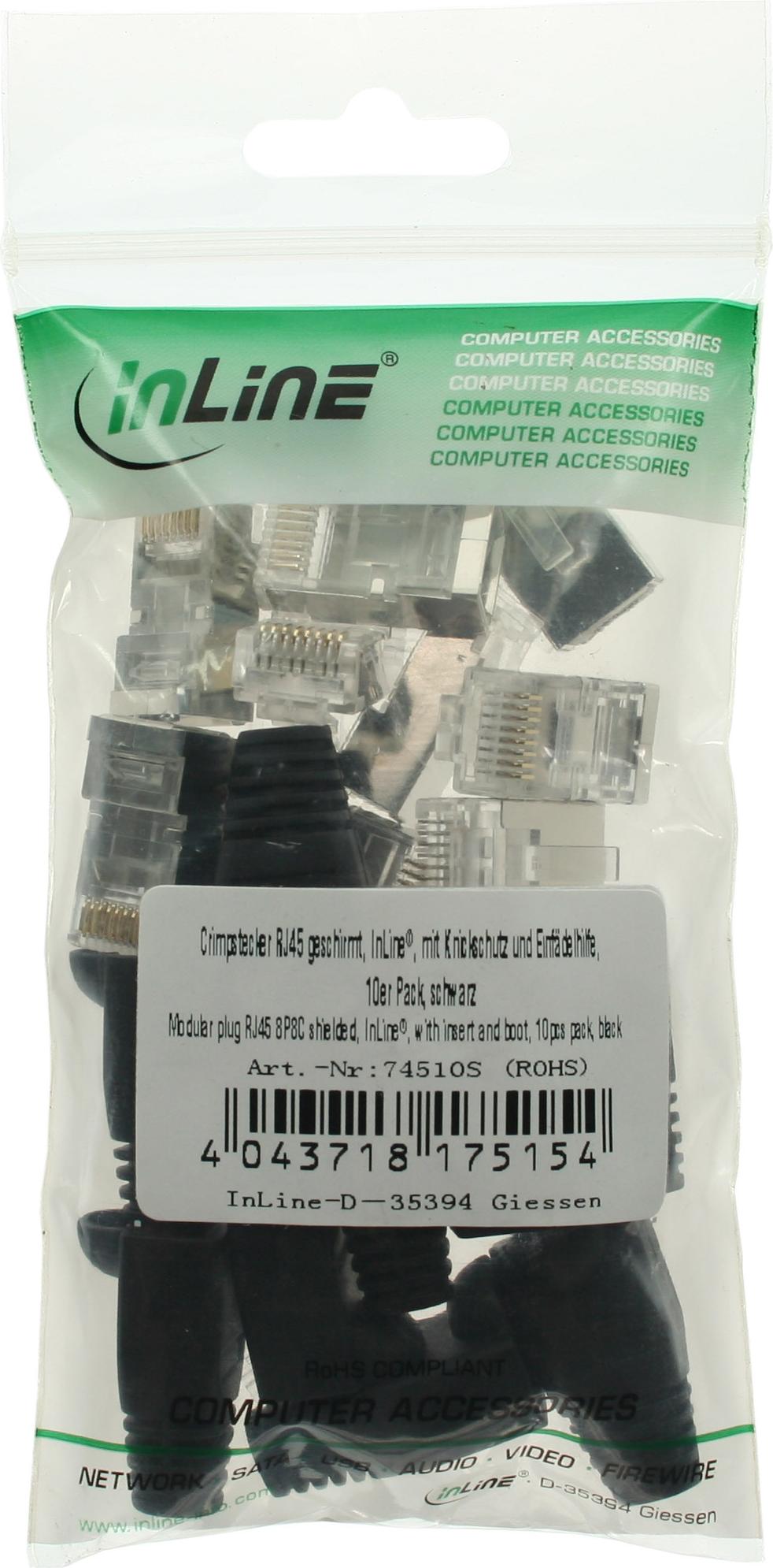 InLine® Crimpstecker RJ45 geschirmt, mit Knickschutz und Einfädelhilfe, 10er Pack, schwarz (74510S)