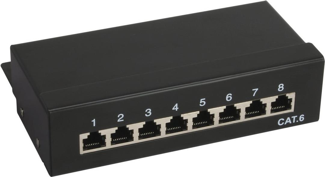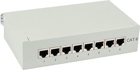 In diesem Desktop Patchfeld können bis zu 8 Verlegekabel über LSA Schneidklemmen angeschlossen werden. Das Patchfeld ist bis Cat. 6 ausgelegt und ist voll abgeschirmt. Die RJ45 Anschlüsse sind durchnummeriert. • Zur Tisch- und Wandmontage geeignet