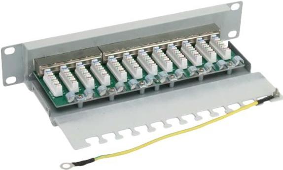 InLine® Patchfeld Cat.6, 12-fach, 25,4cm (10\"), 1HE, lichtgrau, RAL7035• Voll geschirmt• mit LSA Schneidklemm Anschlusstechnik• 25,4cm (10\") Einbau• mit 12x RJ45 Buchsen nach TIA568A oderTIA568B belegbar• mit Laschen für Kabelbinder zur Zugentlastung• mit Erdungslitze