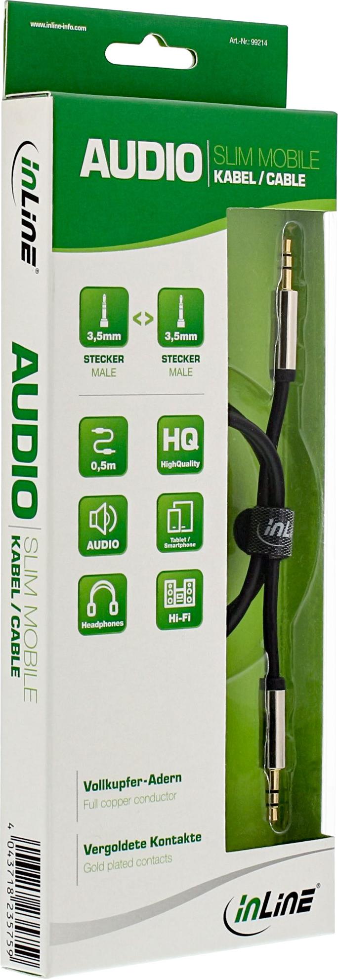 Ob im Auto, in der Bahn, beim Training oder auf einem Ausflug mit Freunden, die InLine® Slim Audio Cables sind Ihr idealer Begleiter. Diese extra dünnen, hochflexiblen Kabel sind mit platzsparenden Slimline-Steckern ausgestattet. Genießen Sie Freiheit ohne Kompromisse bei der Klangqualität. Reine Kupferdrähte und vergoldete Stecker sorgen für die beste Leistung Ihrer persönlichen Geräte.• Extra dünnes und flexibles Slim-Audiokabel in Mobilqualität