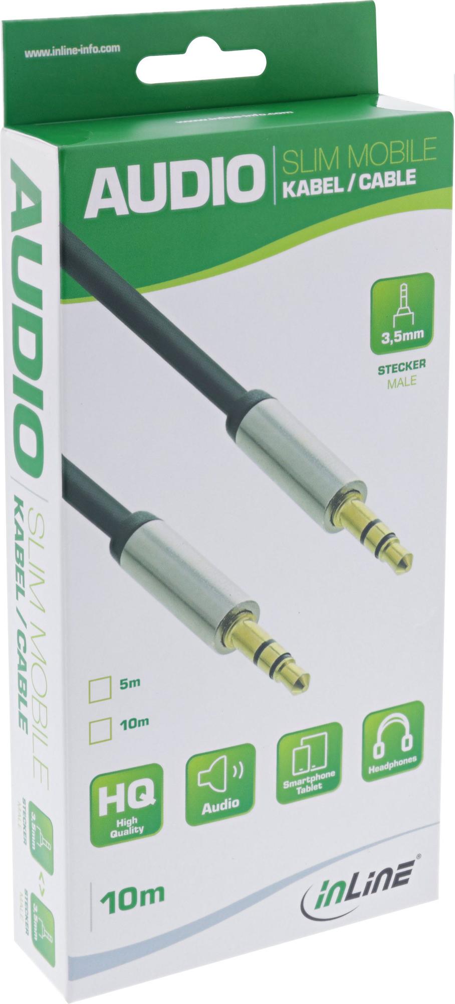 Ob im Auto, in der Bahn, beim Training oder auf einem Ausflug mit Freunden, die InLine® Slim Audio Cables sind Ihr idealer Begleiter. Diese extra dünnen, hochflexiblen Kabel sind mit platzsparenden Slimline-Steckern ausgestattet. Genießen Sie Freiheit ohne Kompromisse bei der Klangqualität. Reine Kupferdrähte und vergoldete Stecker sorgen für die beste Leistung Ihrer persönlichen Geräte.• Extra dünnes und flexibles Slim-Audiokabel in Mobilqualität