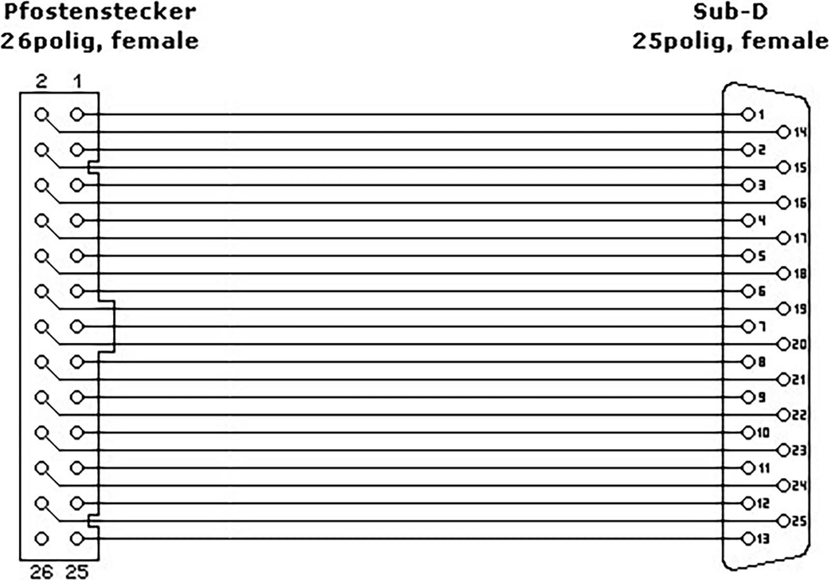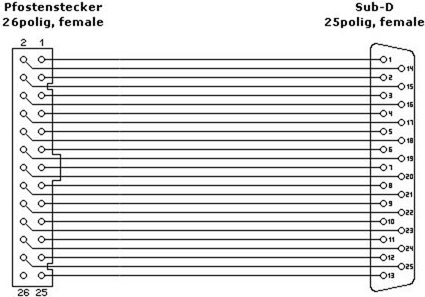 • Belegung (IDC - Sub-D): 1-1, 2-14, 3-2, 4-15, 5-3, 6-16, 7-4, 8-17, 9-5, 10-18, 11-6, 12-19, 13-7, 14-20, 15-8, 16-21, 17-9, 18-22, 19-10, 20-23, 21-11, 22-24, 23-12, 24-25, 25-13, Pin 26 an IDC Buchsenleiste nicht belegt
