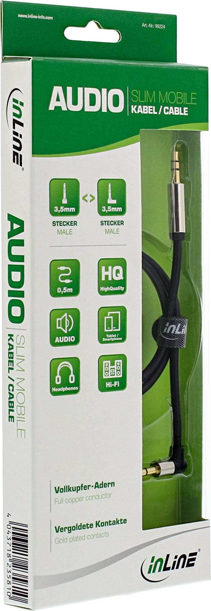 Perfekt, um auf jeder Reise Musik zu hören!Ob im Auto, in der Bahn, beim Training oder auf einem Ausflug mit Freunden, die InLine® Slim Audio Cables sind Ihr idealer Begleiter. Diese extra dünnen, hochflexiblen Kabel sind mit platzsparenden Slimline-Steckern ausgestattet. Genießen Sie Freiheit ohne Kompromisse bei der Klangqualität. Reine Kupferdrähte und vergoldete Stecker sorgen für die beste Leistung Ihrer persönlichen Geräte.• Extra dünnes und flexibles Slim-Audiokabel in Mobilqualität• Klinke 3,5 mm Stecker auf Klinke 3,5 mm Stecker 90° gewinkelt• Klinkenstecker mit 3 Kontakten (Pole) für Stereosignale• Robuste, dünne, vernickelte Metallstecker mit vergoldeten Kontakten• Kabel mit reinem Kupferdraht für verbesserte Signalqualität• Flexibles schwarzes PVC-Rundkabel, ideal für den Einsatz unterwegs