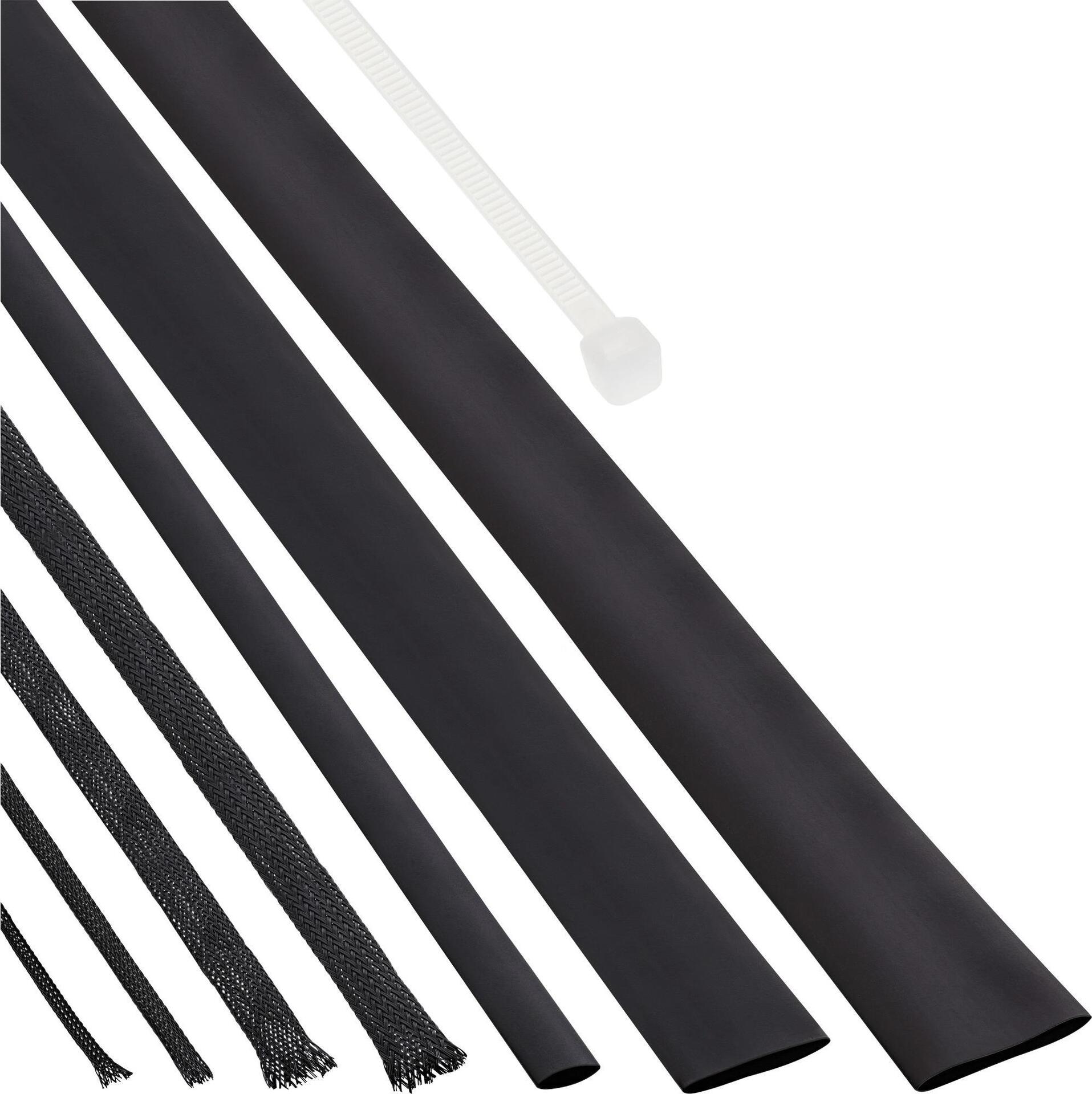 Das Kabelschlauch Set besteht aus 4 verschiedenen Kunststoff-Gewebemänteln, Kabelbindern und 3 Größen Schrumpfschlauch. Das Set beinhaltet:• 3m 1/8" Gewebeschlauch (Durchmesser ca. 3mm)