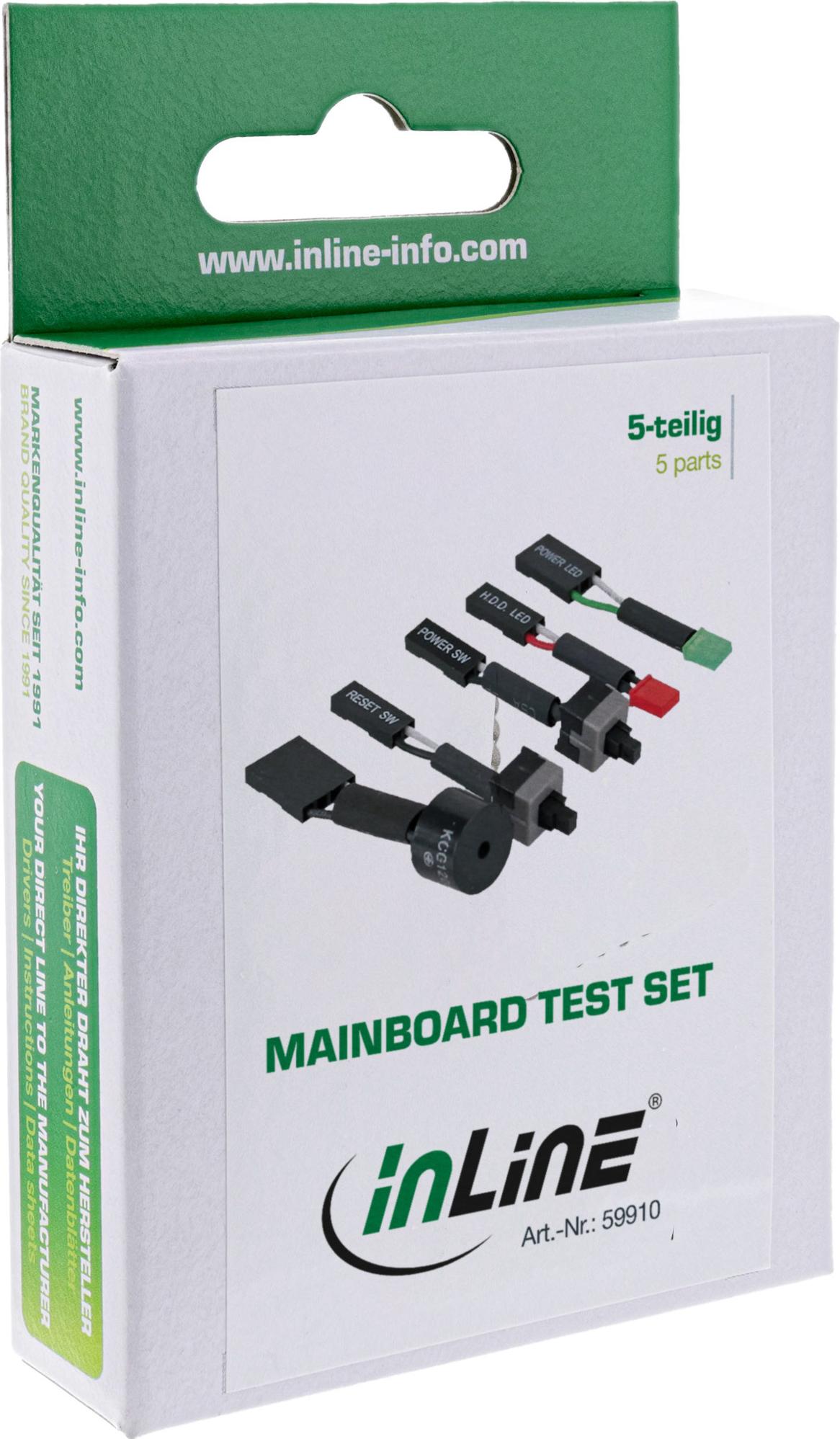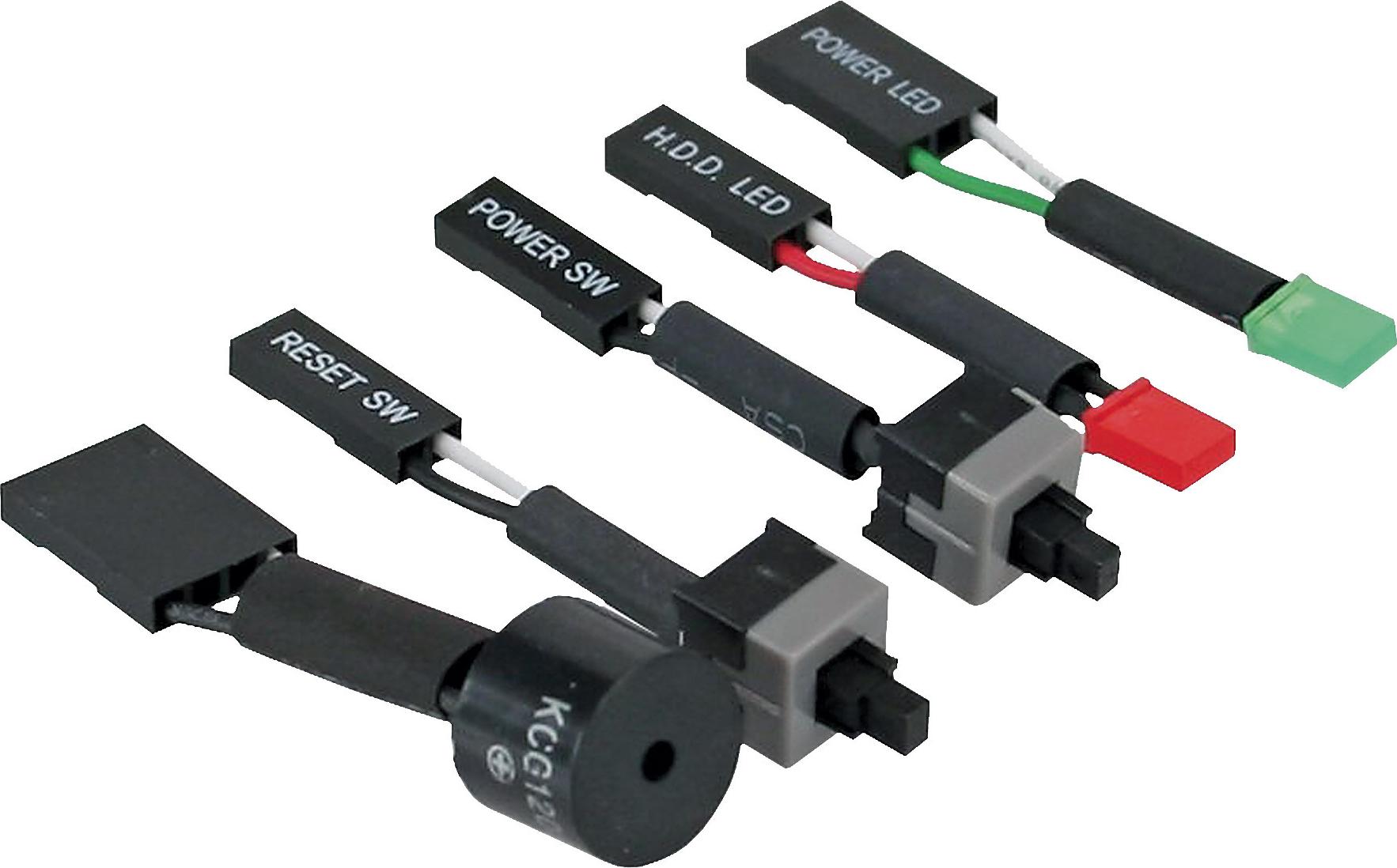 Einfaches Set zum Testen von Mainboards, ohne die langen Kabel aus dem Gehäuse zu verwenden. Das Set besteht aus 2 Tastern, 2 LED's und 1 Speaker, die direkt auf die Pfostenstecker des Mainboards angeschlossen werden.