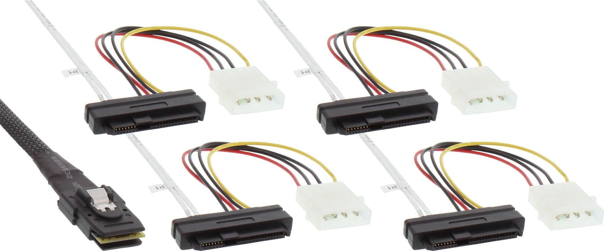 InLine SAS Anschlusskabel, Mini-SAS SFF8087 an 4x SAS + Strom, SAS HDD an Controller, 75cm (27621)