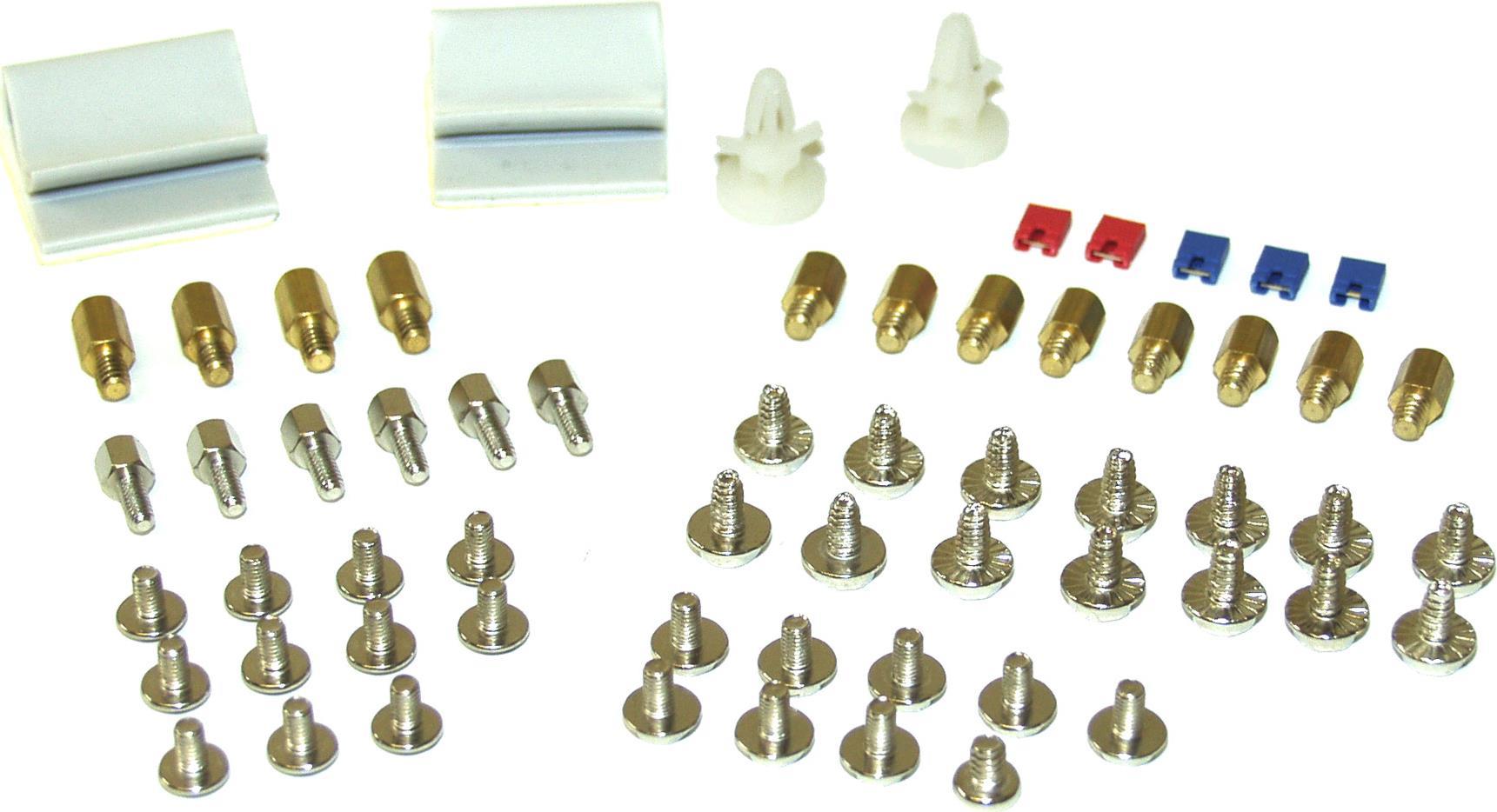 Produkttext[/head]Schraubenset mit Abstandshalter für Mainboards (PVC und Messing), ca. 30 Schrauben mit unterschied-lichen Gewinden, Kabelclips sowie Jumper. 63-teilig[head]Hauptmerkmale