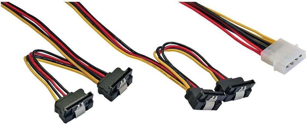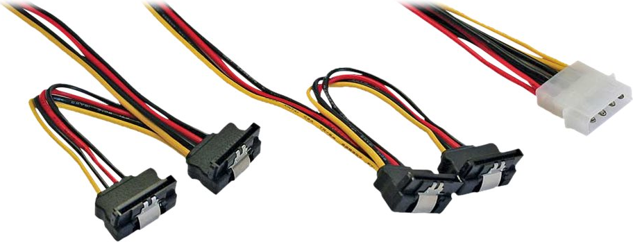 4-faches Stromanschlusskabel für SATA Festplatten an Standard Netzteile• 4pol. Stromstecker an vier gewinkelte 15pol. SATA Stromstecker• 8x AWG 20 Litzen• Länge: ca. 40+15cm und 55+15cm
