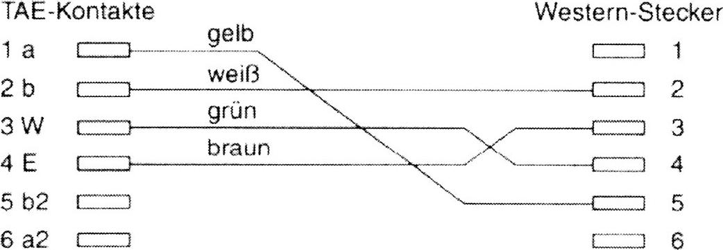 • Belegung (TAE-F zu RJ11): 1(a)-5, 2(a)-2, 3(W)-4, 4(E)-3