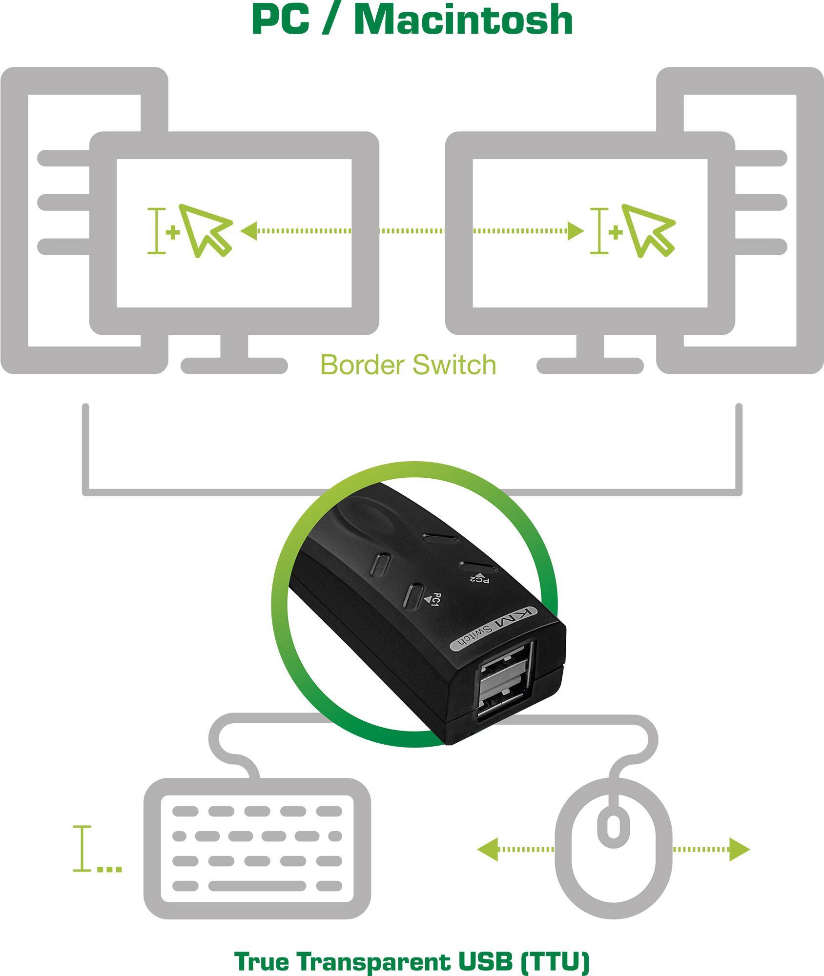Der KM-Umschalter ist ein 2-Port Tastatur-Maus-Umschalter, in dem die neueste Border Switch- und True Transparent USB (TTU)-Emulationstechnik integriert ist. Mit der Border Switch-Technik gleitet die Mausanzeige nahtlos von einem PC-Monitor zum nächsten. So können Sie zwei getrennte Desktops zu einem erweiterten virtuellen Desktop kombinieren. Die TTU-Technologie ermöglicht ultimative Kompatibilität zu allen Tastatur- und Mausmodellen und damit das beste Erlebnis für nahtlosen Tastatur-Maus-Wechsel. Weiterhin unterstützt Der Umschalter sowohl PCs als auch Macintosh-Rechner.• Anzahl der Ports: 2• Maus und Tastatur steuern 2 Computer an 2 Monitoren• Maus kann nahtlos zwischen den Monitoren wechseln, Umschaltung per Maus automatisch oder per Hotkey• Zwei verschiedene Desktops in einem virtuellen erweiterten Desktop kombinieren• 2x USB Stecker auf 2x USB Buchse, Kabellänge ca. 1,2m• Mac ab OSX 10.3 und Windows (ab Win 98SE) kompatibel• Spannungsversorgung über USBBitte beachten Sie:Die InLine KVM-Switche sind ausgelegt für Anwendungen im Office und Home-Office-Bereich sowie zur Überwachung und Steuerung mehrerer Computer von einem Arbeitsplatz aus.Die KVM-Switche sind jedoch nicht geeignet für Gaming-Zubehör wie Mäuse und Tastaturen mit programmierbaren Sondertasten, auch Gaming-Monitore mit hohen Frequenzen ab 120Hz werden nicht unterstützt.Die Hotkey-Funktion für die Tastatur funktioniert nur am dafür vorgesehenen Konsolen-USB-Port, über die USB-Hub-Ports angeschlossen, ist die Hotkey-Steuerung nicht möglich.