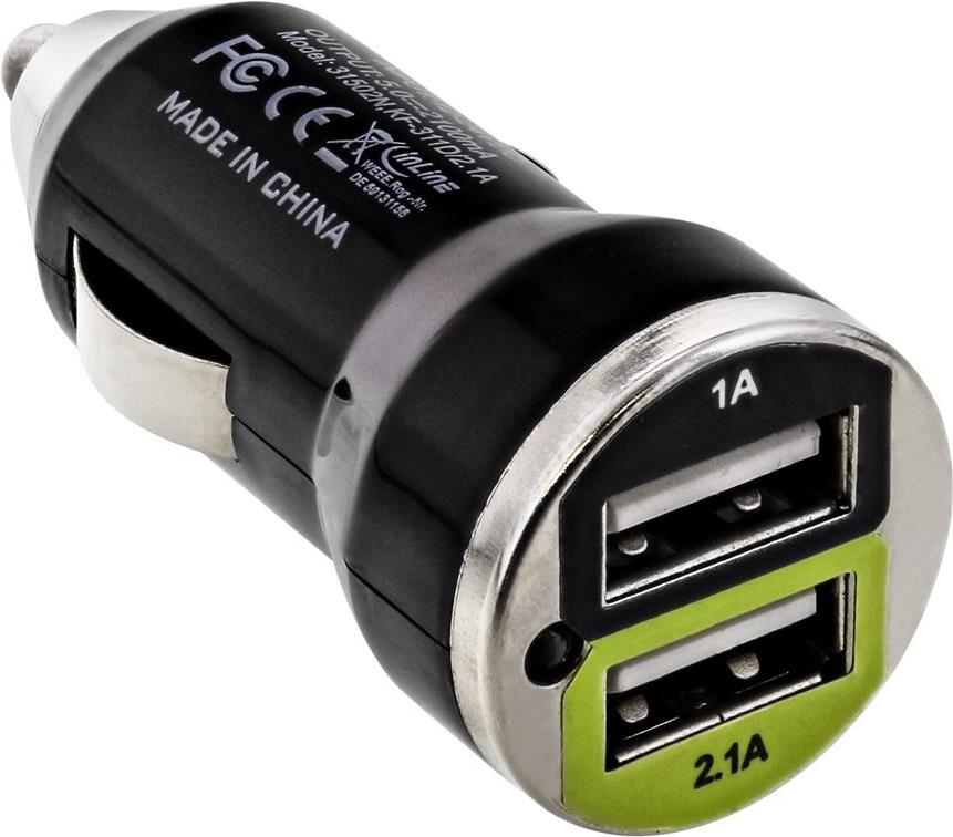 Produkttext[/head]Wandeln Sie mit diesem Adapter die 12V/24V KFZ Steckdose in einen 5V USB Anschluss. Es kann Ihr GPS-Navigationssystem, Ihren MP3-Player, iPod, iPhone oder jedes weitere mobile USB Gerät laden und mit Spannung versorgen. Bei Verwendung der grün markierten USB-Buchse können die 2,1A vollständig genutzt werden. Die maximale Stromabgabe von 2,1A wird bei gleichzeitiger Verwendung beider USB Buchsen geteilt.Eingangsspannung 12-24V DC über KFZ-SteckdoseAusgang: 5V DC, 2x USB A Buchse, max. 2,1AAbmessungen: ca. 45x25mm[head]Hauptmerkmale