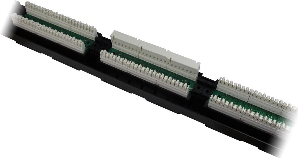 Patchpanel für den Anschluss und die Verteilung der LAN-Kabel. Die zu verlegenden Kabel werden auf der Rückseite per LSA Plus angelegt, vorne können die Patchkabel per RJ45 Buchse angeschlossen werden.