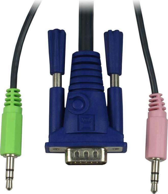 Der Anschluss des KVM erfolgt per USB (Tastatur/Maus), 2 x 3,5 mm Klinke (Audio Mic/Line) und DB15 VGA Monitor über die 2 mitgelieferten Anschlusskabel, an die Computer.