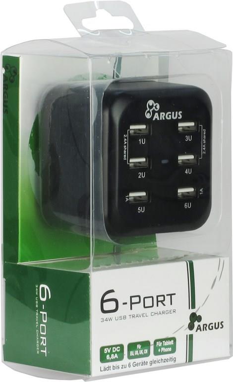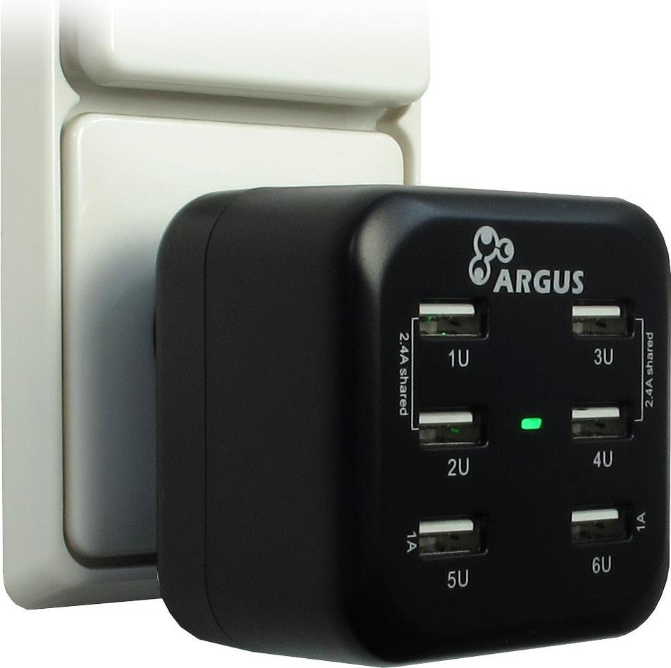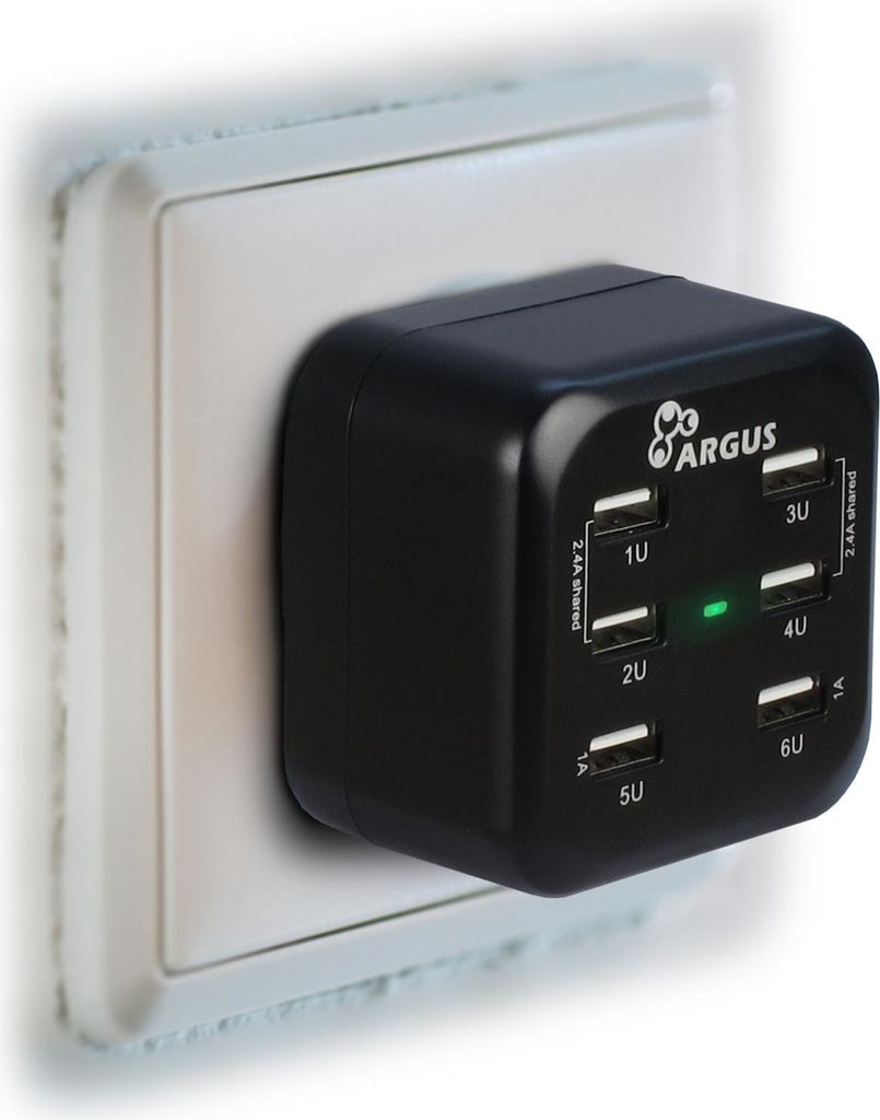 Mit dem Argus LS-6US steht Ihnen ein USB-Ladegerät mit insgesamt 6 USB-Ladeports und einer Ausgangsleistung von bis zu 34 W zur Verfügung. So lassen sich wahlweise zwei Geräte mit je 2.4 A und zwei Geräte mit je 1 A oder vier Geräte mit je 1.2 A und zwei Geräte mit je 1 A oder insgesamt 6 Geräte mit je 1 Agleichzeitig aufladen.