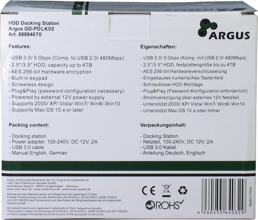 Sie sind im Besitz empfindlicher Daten? Sie möchten, dass nur Sie und niemand anderes diese sehen kann? Dann ist unser Argus GD-PDLK02 dafür die Lösung! Ganz bequem können Sie hier Ihre Daten auf eine 2.5" oder 3.5" HDD/SSD überspielen und anschließend das Laufwerk mit einer 256-bit AES Verschlüsselung versehen.