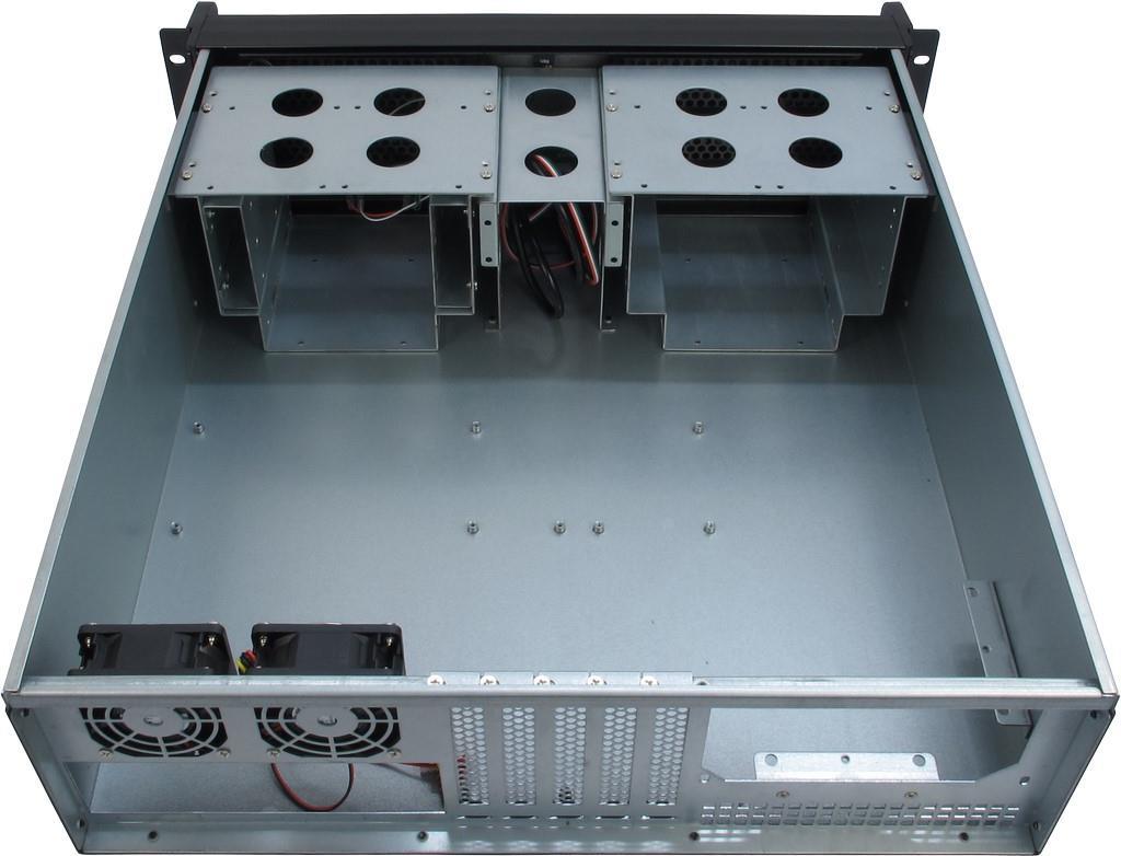 Die Laufwerkskäfige sind mit wenigen Handgriffen entnehmbar und ermöglichen so eine entspannte Montage der Laufwerke. Fünf Einbauslots in voller Bauhöhe sowie eine Einbaumöglichkeit für ein ATX Netzteil runden das Bild ab.